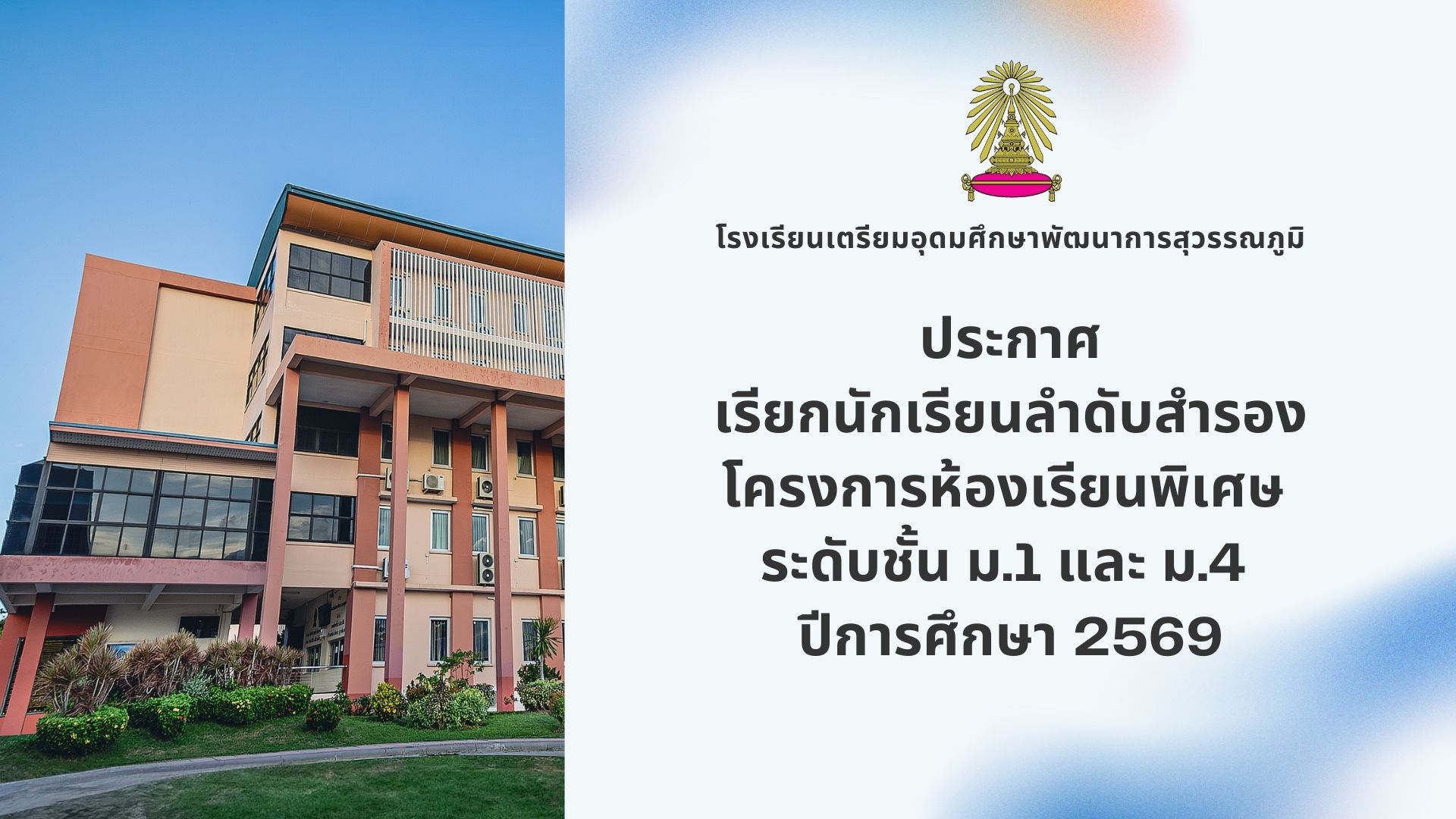 ประกาศเรียกนักเรียนลำดับสำรอง โครงการห้องเรียนพิเศษ ระดับชั้น ม.1 และ ม.4 ปีการศึกษา 2569